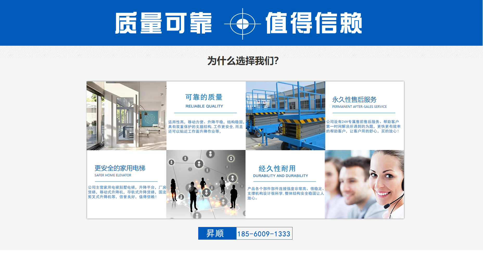 山東昇順液壓升降機(jī)械有限公司是一家主營(yíng)家用電梯,別墅電梯,升降平臺(tái),廠房貨梯,移動(dòng)式升降機(jī),導(dǎo)軌式升降貨梯,固定剪叉式升降機(jī)等產(chǎn)品企業(yè),質(zhì)量可靠,值得信賴。 用戶至上,以用戶為中心”是公司永遠(yuǎn)堅(jiān)持的服務(wù)宗旨,贏得用戶的贊許是我們的榮譽(yù),及時(shí)滿足用戶的需求,是我們公司的愿望。長(zhǎng)期以來(lái),公司員工以優(yōu)質(zhì)的服務(wù),取悅于用戶,以誠(chéng)信的言行取信于用戶,得到了用戶們的好評(píng)。我們期待著與您更加愉快的合作!公司的發(fā)展,離不開(kāi)社會(huì)的大力支持,在社會(huì)的支持和幫助下,我們正昂首闊步邁向未來(lái)! 我們的經(jīng)營(yíng)方針是:以質(zhì)量求生存,以產(chǎn)品求發(fā)展,以信譽(yù)保合作,以服務(wù)贏客戶。 本公司對(duì)產(chǎn)品質(zhì)量和各項(xiàng)服務(wù)恪守合同承諾,并愿與新老客戶精誠(chéng)合作,共創(chuàng)未來(lái)。 公司精神:創(chuàng)新是主題,超越是不懈的追求。 公司宗旨:信譽(yù)保證,誠(chéng)信為本。 我們會(huì)以合理的價(jià)格,良好的信譽(yù),雄厚的實(shí)力,優(yōu)質(zhì)的產(chǎn)品,最周到的服務(wù),服務(wù)于廣大新老客戶!...